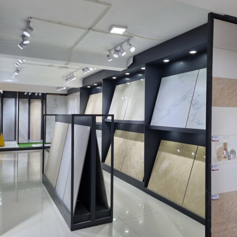 Kệ nghiêng trưng bày gạch là giải pháp tốt cho hầu hết các cửa hàng showroom bày bán gạch men, gạch ốp lát. Kệ nghiêng trưng bày gạch lát nền phù hợp với các không gian có nhiều tường và vách ngăn.
