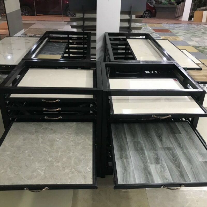 Kệ trưng bày gạch ngăn kéo đáp ứng được nhiều mẫu gạch lát nền có kích thước khác nhau và giúp cho khách hàng quan sát sản phẩm mẫu được trực quan và dễ dàng hơn.