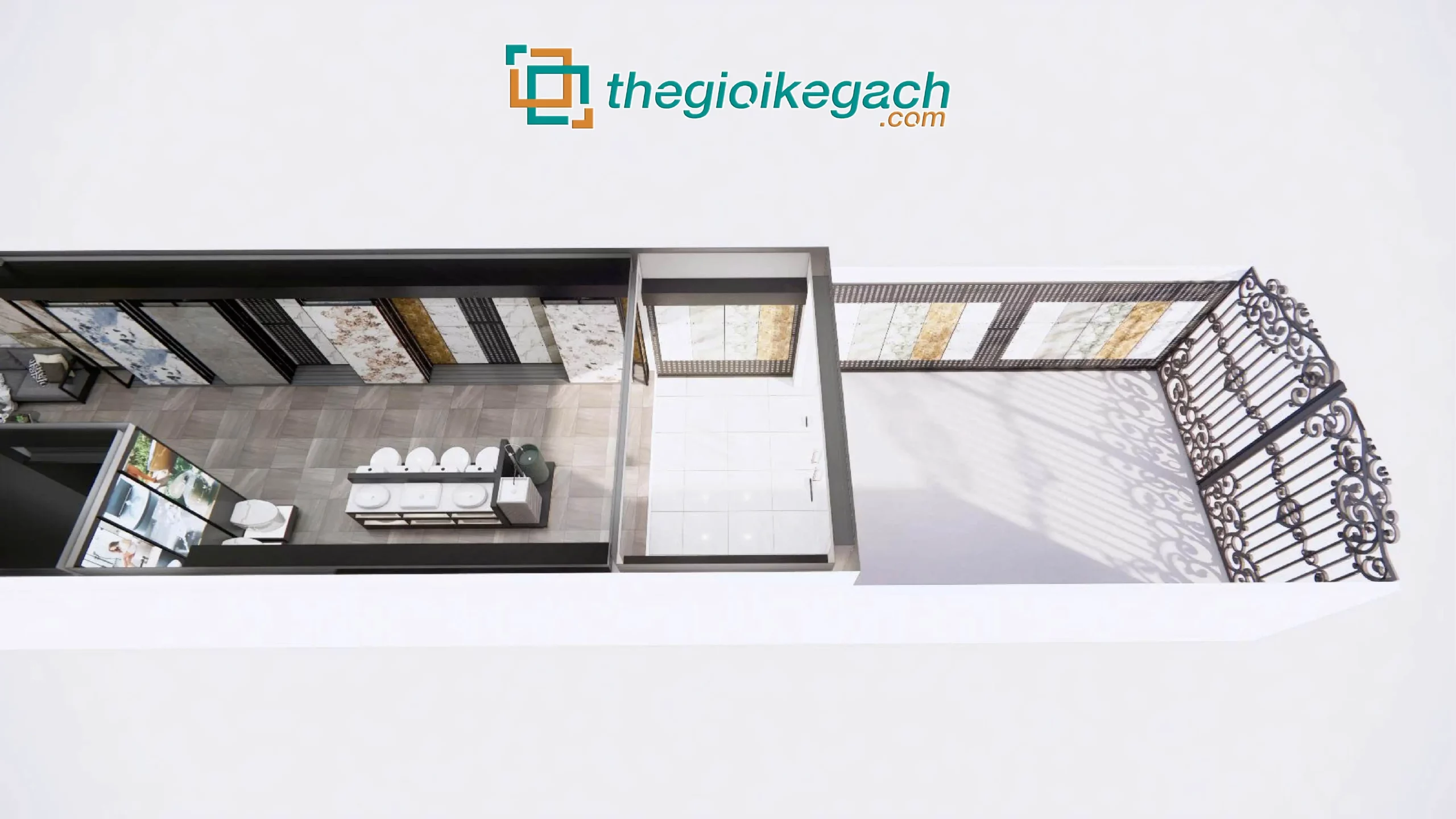 Khu phối cảnh thực tế: Thế Giới Kệ Gạch thiết kế bệ gạch phối sàn – ốp tường theo tông màu, giúp khách hàng dễ dàng hình dung khi ứng dụng thực tế.