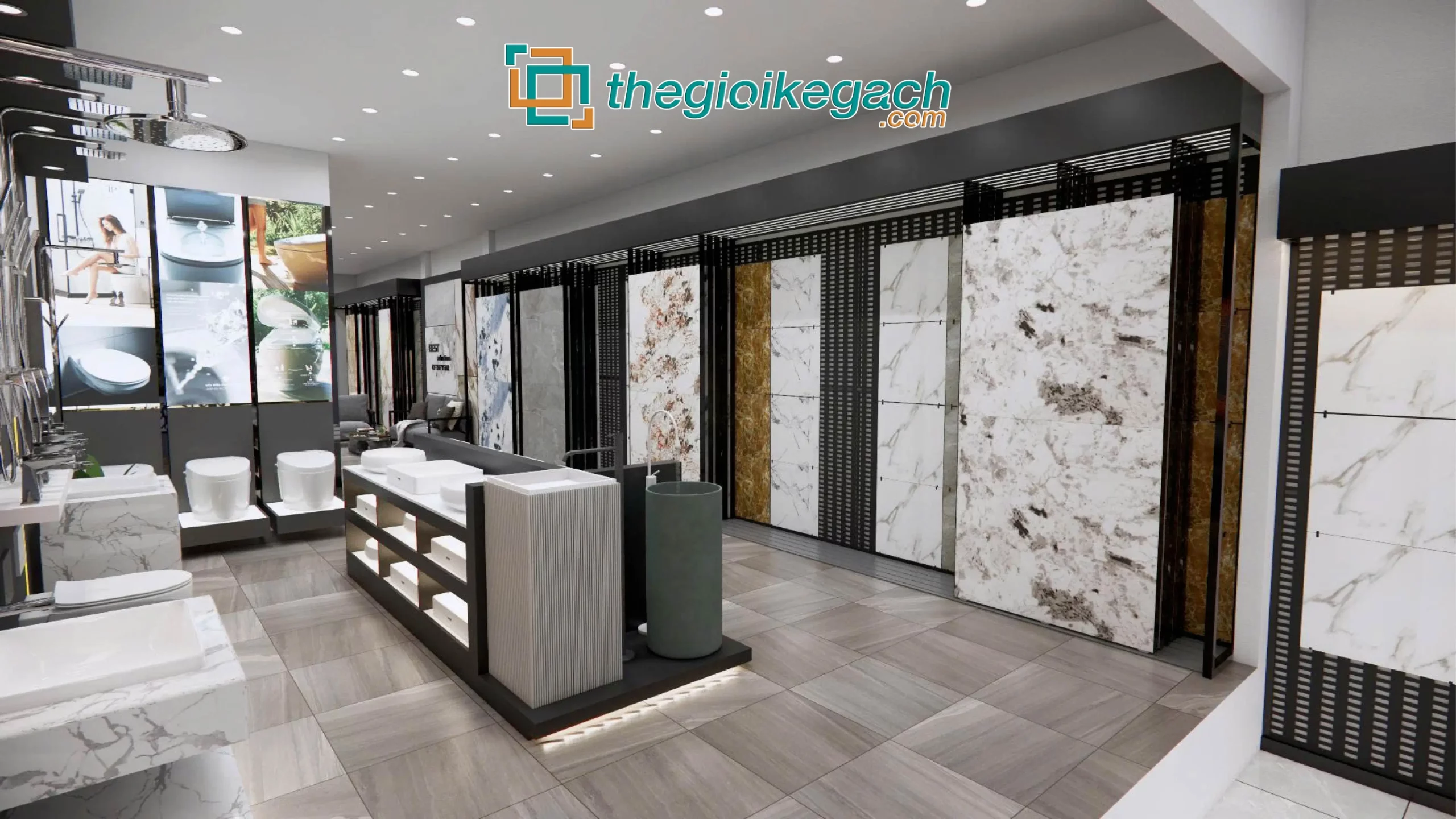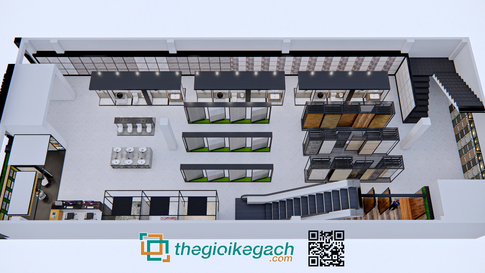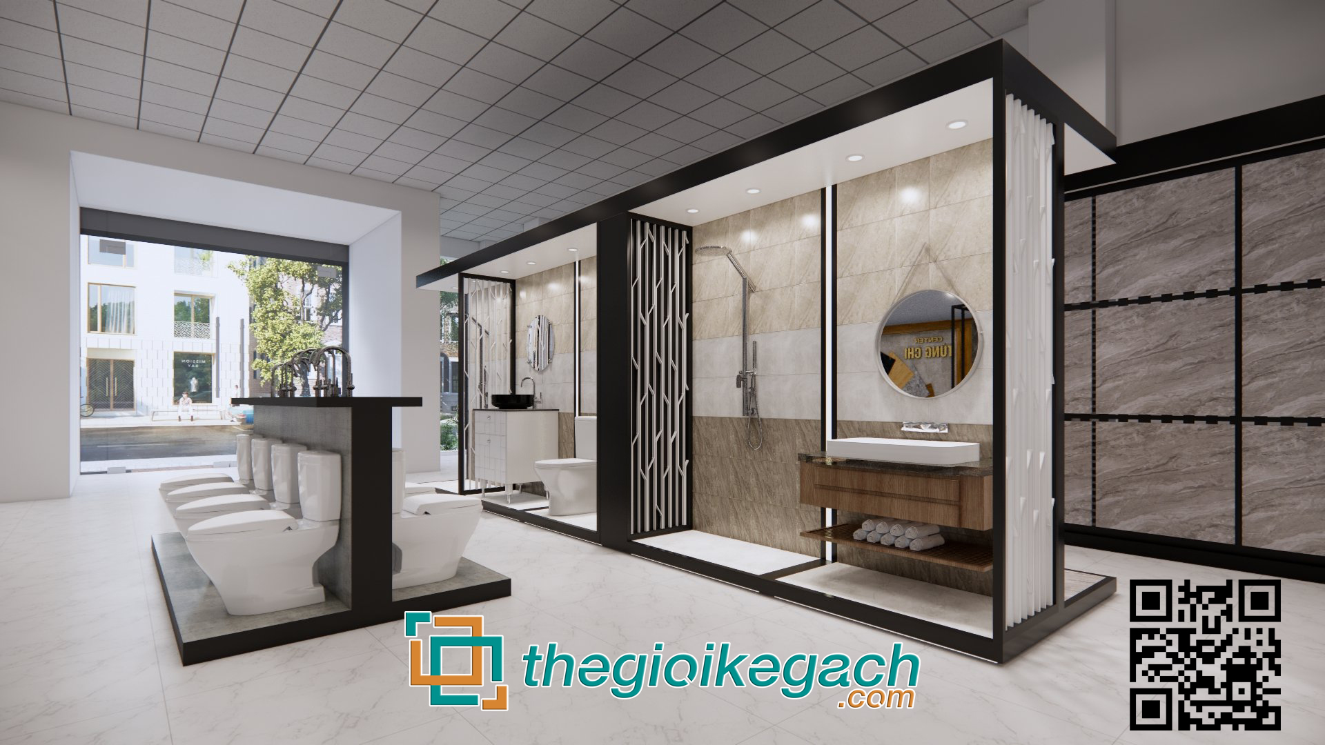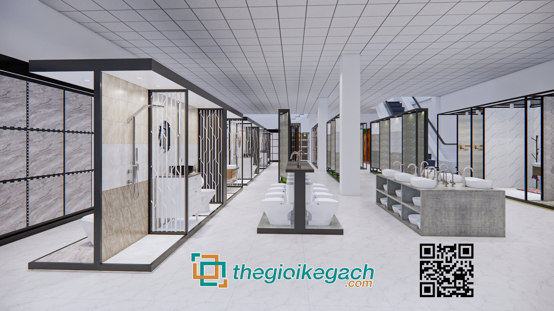 Mẫu showroom trưng bày gạch nhỏ gọn dưới 100m2 đầy đủ các loại kệ trưng bày TBVS,...