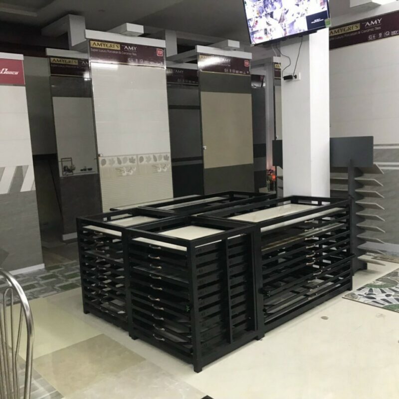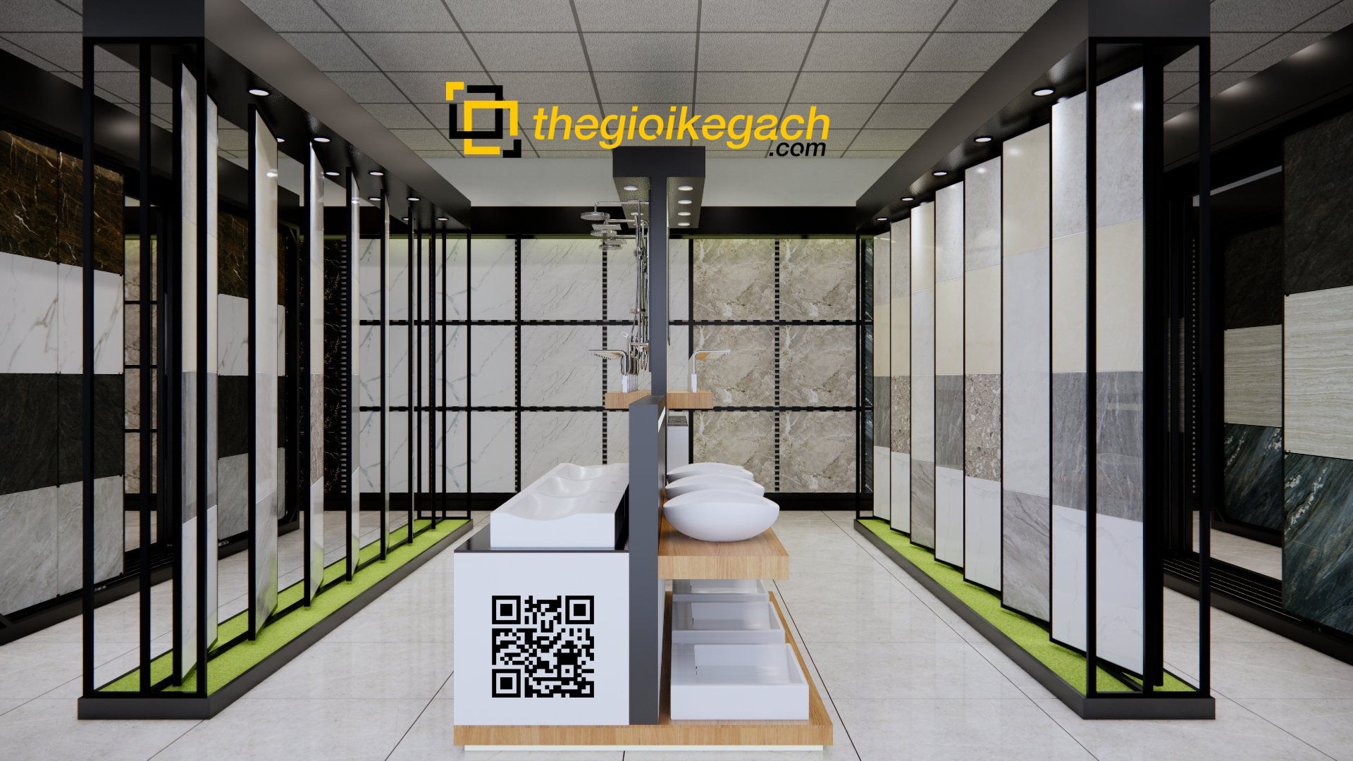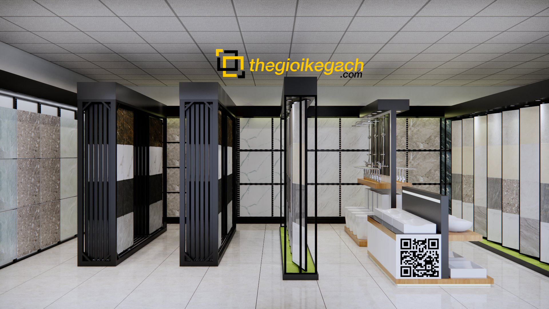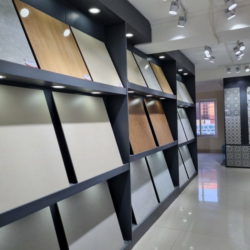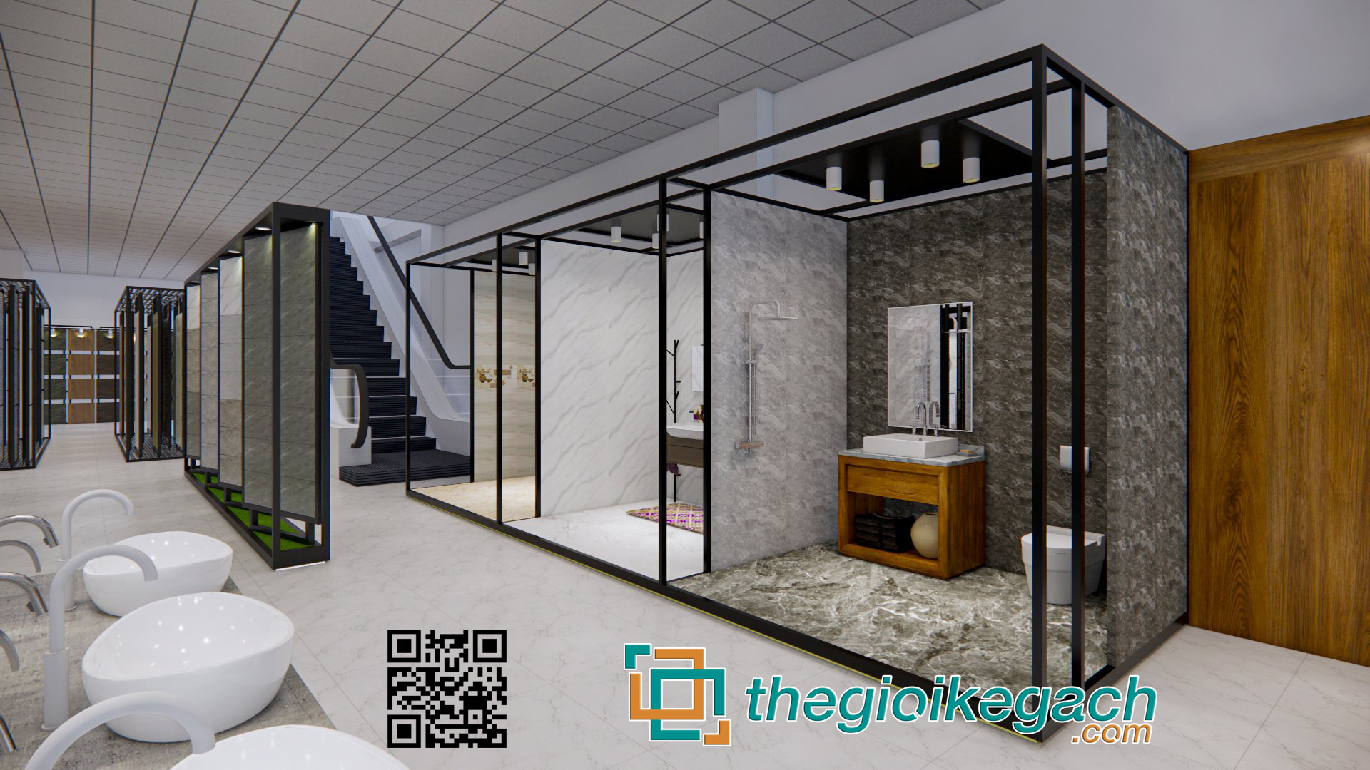 Mẫu showroom trưng bày gạch nhỏ gọn dưới 100m2 đầy đủ các loại kệ trưng bày TBVS,...